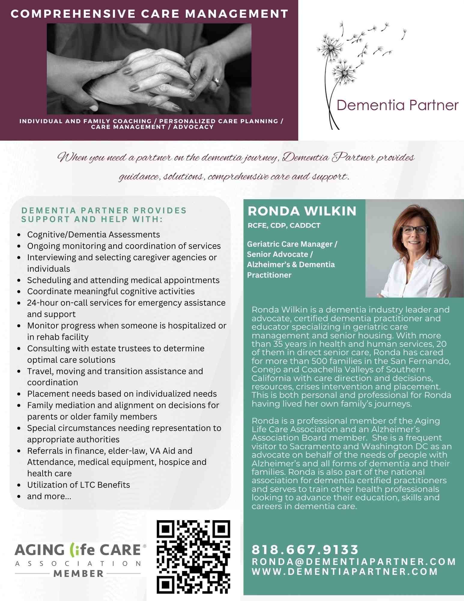 Dementia Partner is dedicated to providing comprehensive care management for Alzheimer's and Dementia patients as well as their families. Our team is committed to offering valuable resources and support for caregivers, ensuring that your loved ones receive the highest quality of care. We understand the challenges of dementia care and are here to guide you through every step of the journey.