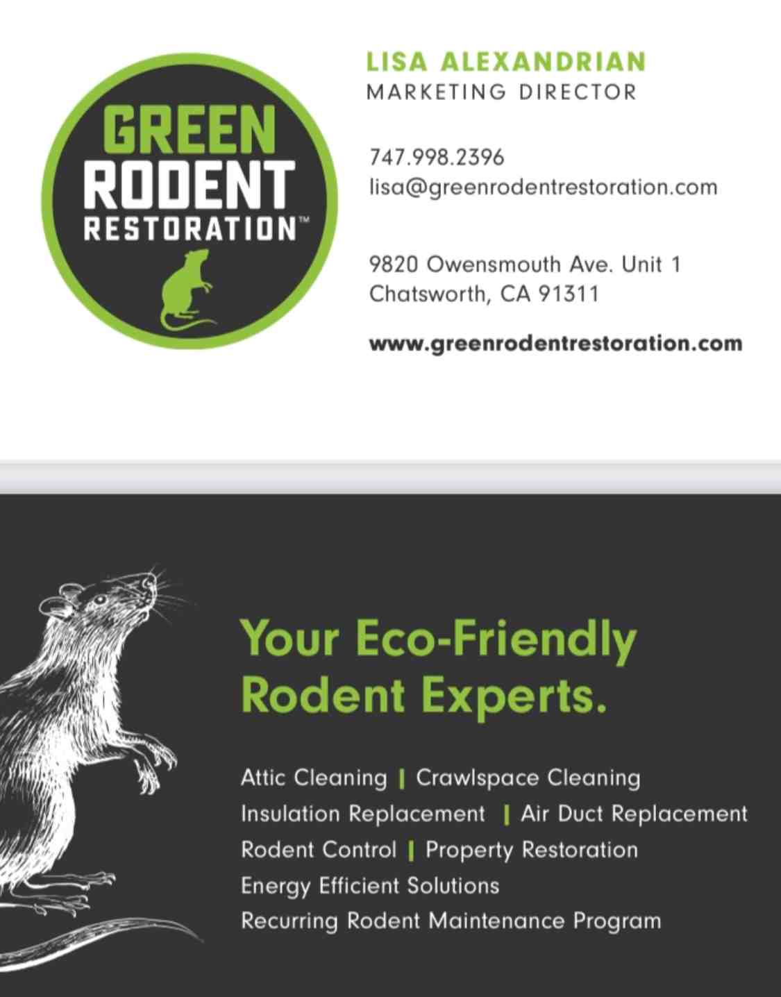 Servicing the entire Los Angeles, Ventura and Orange Counties. Feel free to contact us by phone or email at: lisa@greenrodentrestoration.com