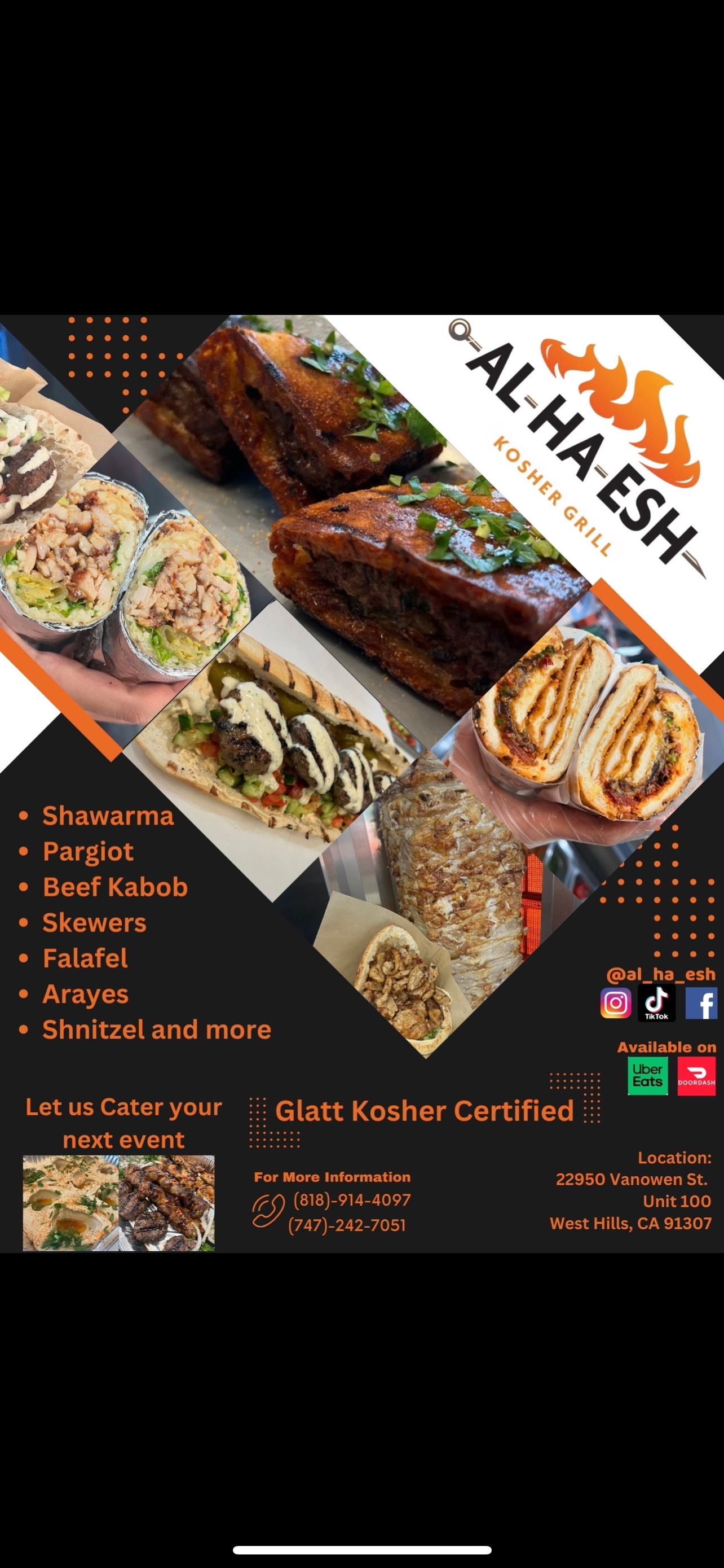 At Al-Ha-Esh Kosher Grill, we blend tradition and flavor to create an unforgettable dining experience. Every dish is prepared to strict kosher standards, from sizzling grilled specialties to comforting classics full of flavor. Whether you’re a longtime lover of kosher cuisine or trying it for the first time, you’ll find food that’s both authentic and delicious. Come taste the extraordinary at Al-Ha-Esh Kosher Grill. Be sure to mention you're from Maiden Community when you come in to order!